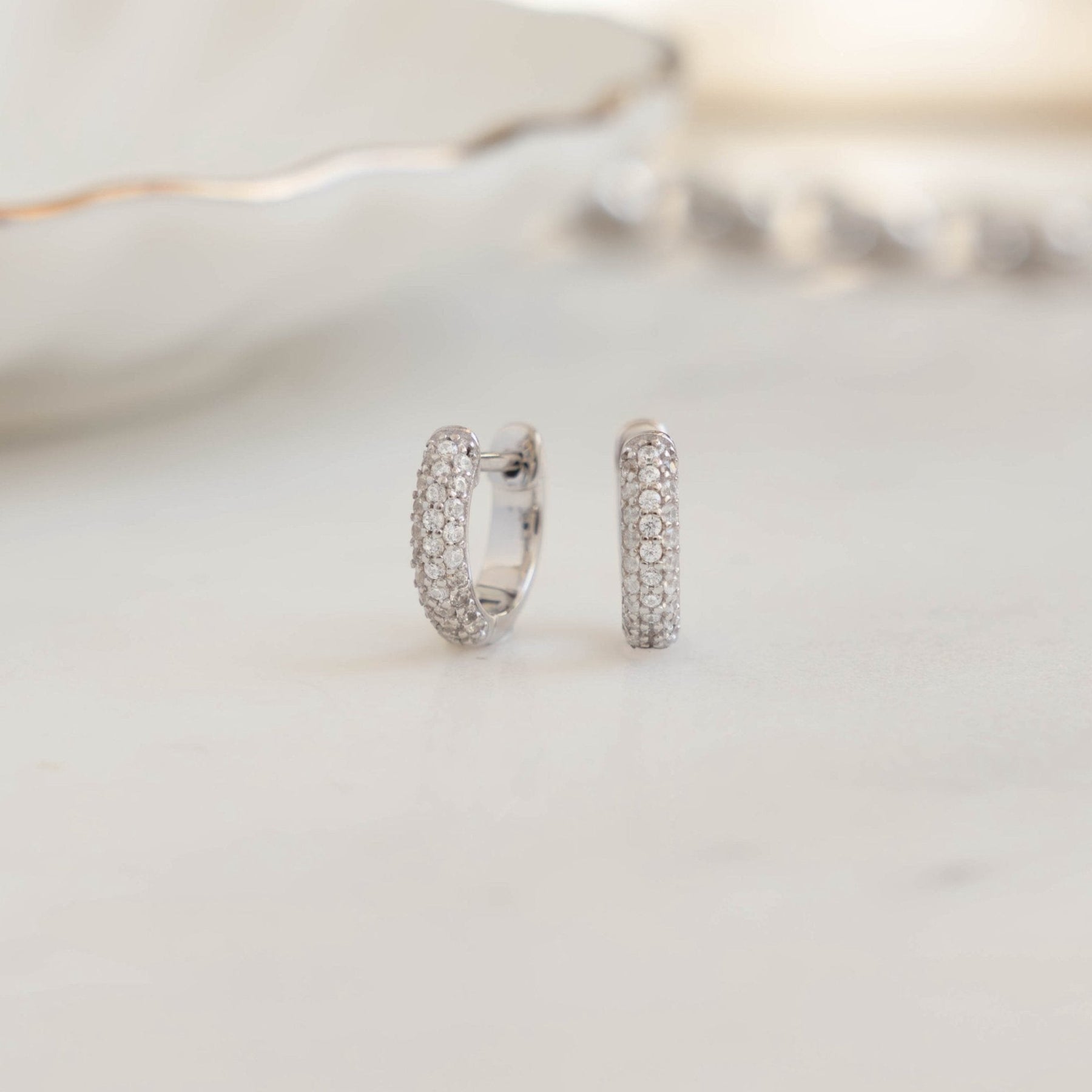 Design: Delicate pavé huggie hoops – perfect for everyday wear, multiple piercings, or bridal looks