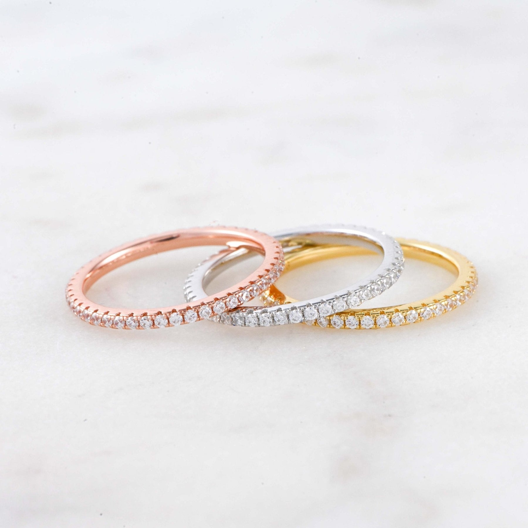 Design: Full eternity band with pavé-set CZ stones around the entire ring – perfect for stacking or wearing solo